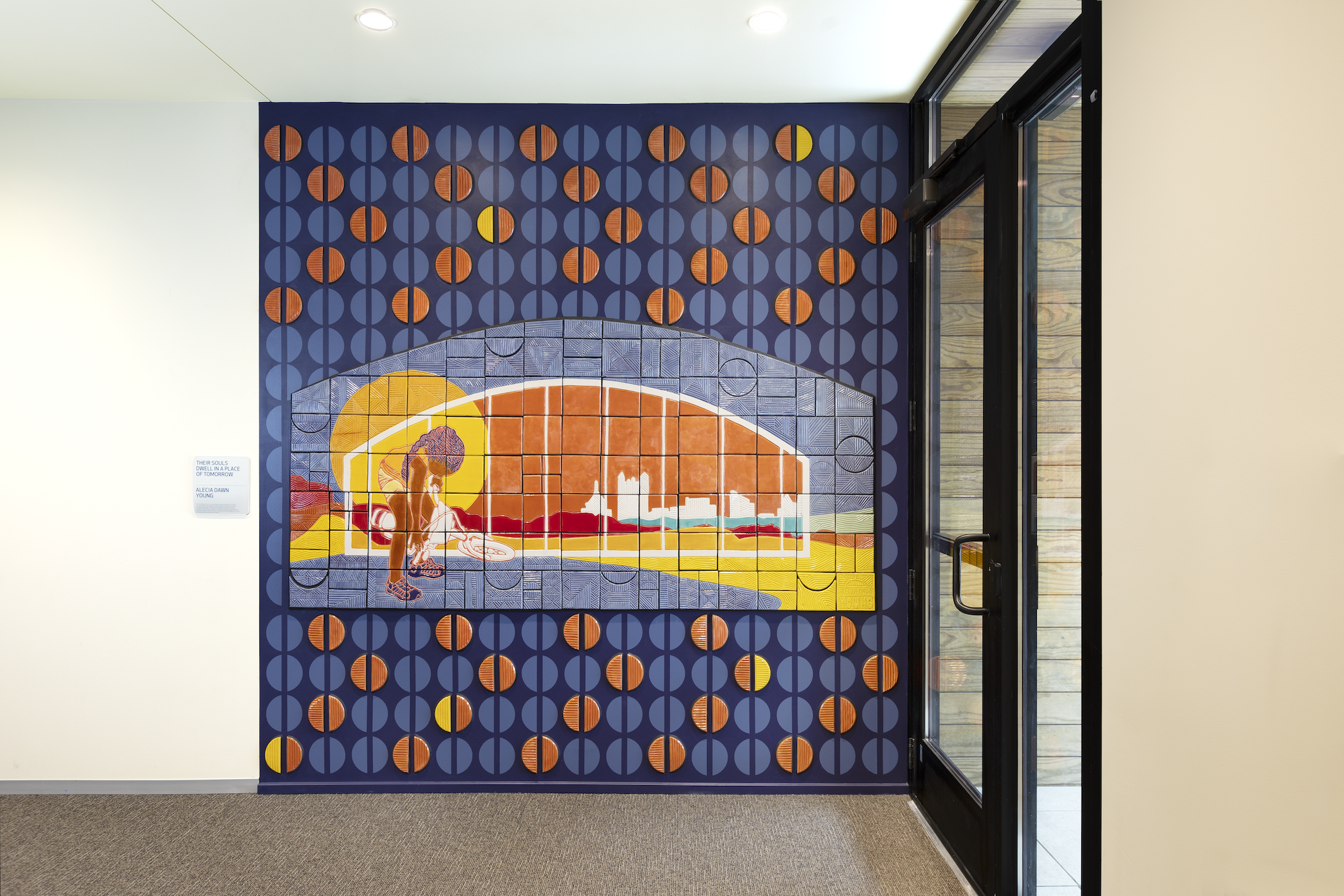 Their souls dwell in a place of tomorrow is an 80 sq ft. paint and ceramic tile mural installed on the top floor of the Pittsburgh Foundation’s new office space.